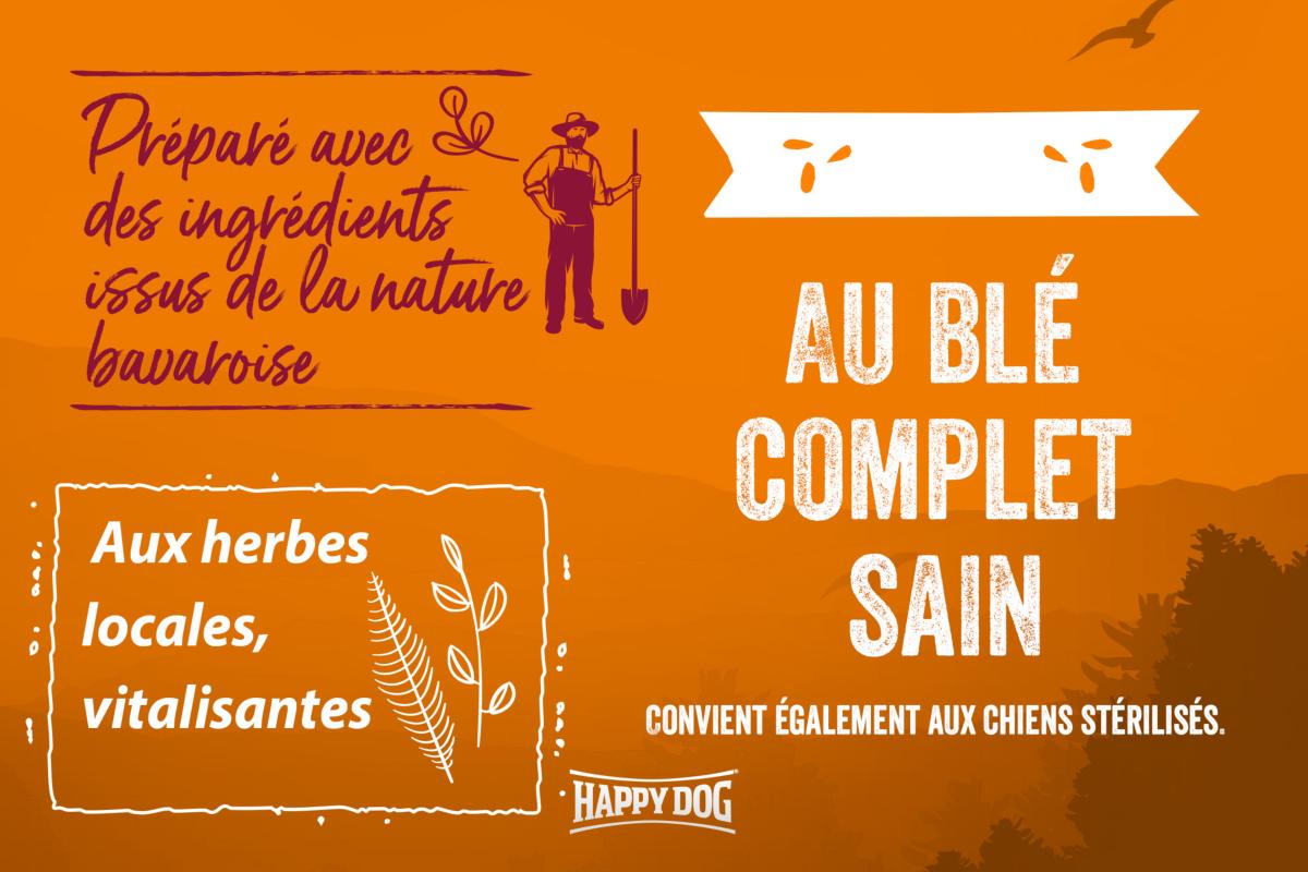 Votre chien va adorer cet aliment complet équilibré et adapté à son espèce, préparé à partir des meilleurs ingrédients de l'agriculture bavaroise. Ces croquettes croustillantes contiennent des ingrédients de haute qualité tels que de la savoureuse viande de canard, du riz très bien toléré et des céréales complètes issues de la région. La viande de canard apporte à votre chien des protéines animales de haute qualité et l’énergie dont il a besoin pour jouer et se dépenser. Les céréales complètes fournissent des fibres alimentaires essentielles. Elles aident à réguler l'activité intestinale, rassasient, facilitent la digestion et contribuent à la santé intestinale. Elles représentent également un apport important de vitamines B, de minéraux tels que le magnésium, le fer, le sélénium et le zinc et regorgent de glucides complexes. Cette recette délicieuse et saine contient également de précieuses herbes locales qui fournissent à votre chien de nombreux nutriments essentiels de manière naturelle. Grâce à sa teneur en matières grasses adaptée et à sa teneur élevée en fibres, cette recette convient également particulièrement bien aux chiens stérilisés.