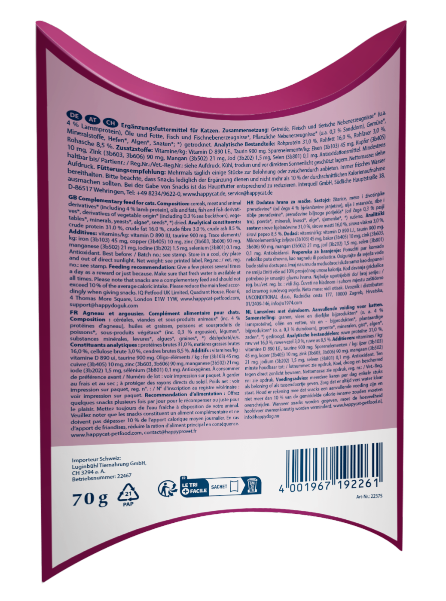 Offrez à votre chat des moments privilégiés remplis d'amour avec la friandise Happy Cat Love Snack en édition limitée, car la Saint-Valentin est pour tout ceux qu'on aime. Ces friandises en forme de cœur, à base d'agneau fin et d'argousier fruité, sont idéales à déguster à tout moment de la journée ou comme petite récompense. Sans sucre ajouté ni conservateurs, vous pouvez gâter votre petit félin sans culpabiliser. Grâce à sa recette sans gluten, même les chats sensibles peuvent savourer cette délicieuse preuve d'amour.
