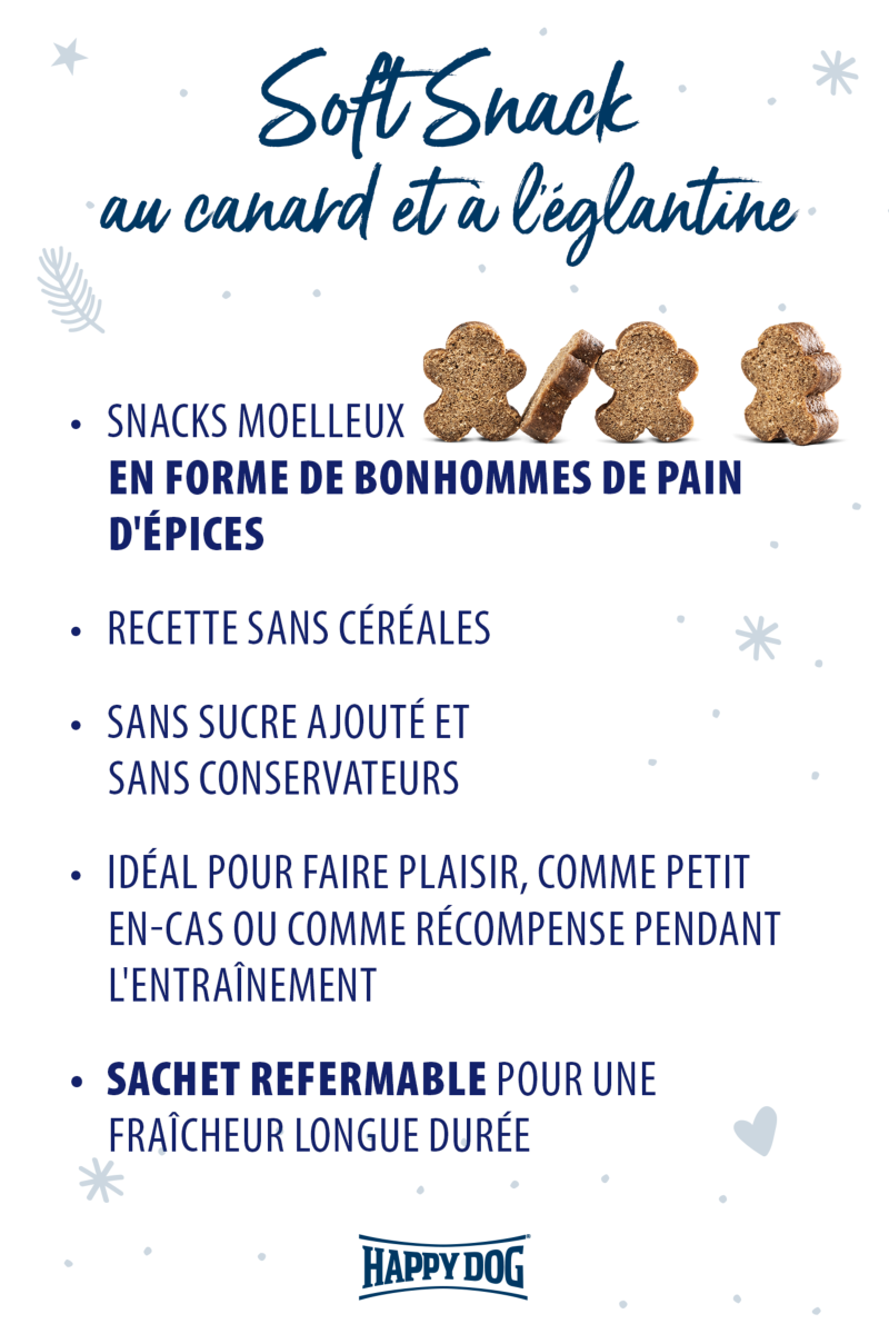 Quoi de mieux que de profiter de la saison froide avec son chien devant un feu crépitant tout en grignotant de délicieux biscuits ? Pour que votre fidèle compagnon puisse profiter de ces moments avec vous, il existe désormais des snacks d'hiver Happy Dog en édition limitée. Ces friandises pour chiens à base de canard savoureux et d’églantine raffinée offrent de véritables moments de plaisir gustatif à votre chien et constituent le complément parfait pour les fêtes de fin d'année. Ces
