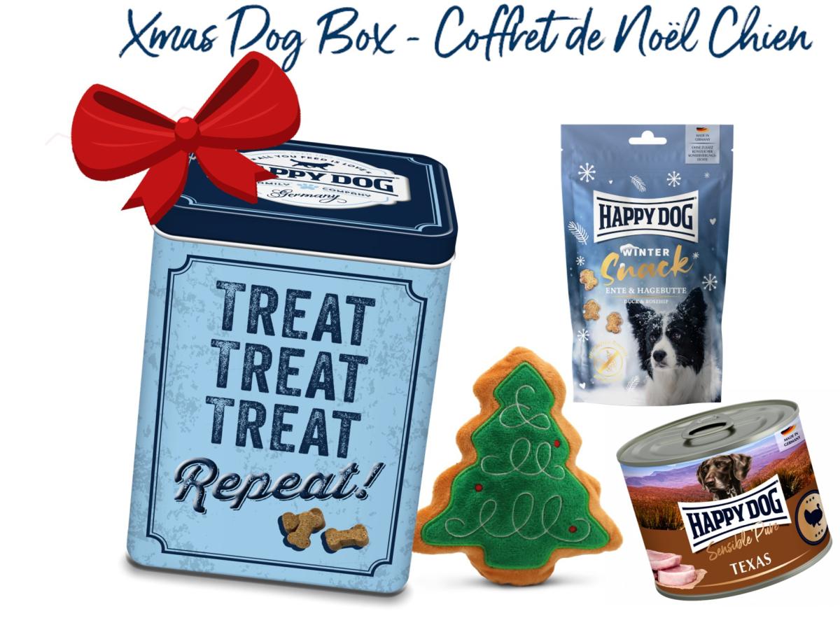 Vous êtes à la recherche du cadeau de Noël parfait pour votre chien ? Ne cherchez plus, nous vous avons concocté le Coffret de Noël Happy Dog pour choyer vos boules de poils comme il se doit. Vous pourrez vous dorlotez au coin du feu, avec chacun vos propres biscuits de Noël. Grâce à cette box de Noël, votre chien pourra lui aussi avoir sa friandise quotidienne de l'avent, son repas de viande pour le dîner de Noël, et bien sûr son jouet sous le sapin.